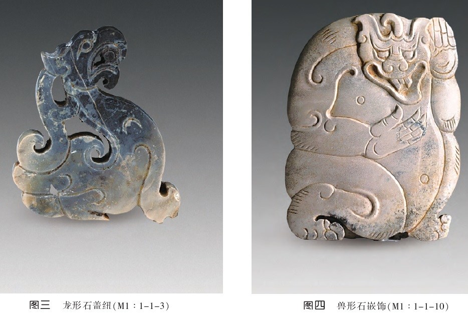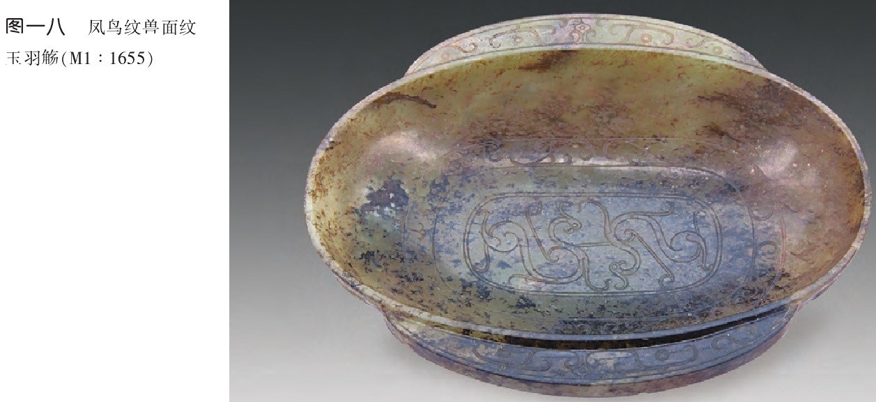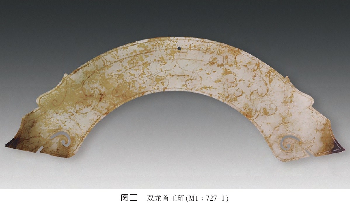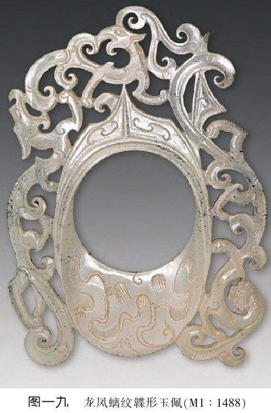 其中舞人玉佩、雙龍首玉珩與石管三件同裝一個漆盒,被認為是同組玉飾;蓋紐和片狀嵌飾多是成對。