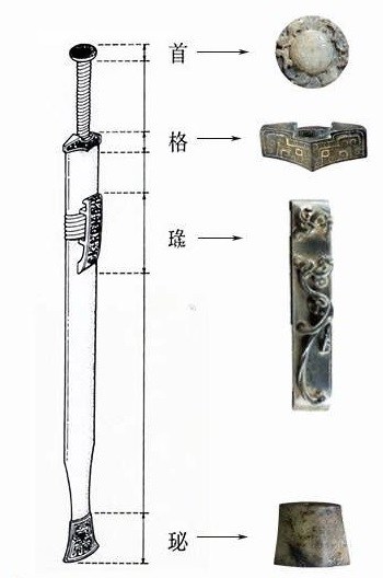 漢劍有四樣裝飾,首、格、璏、珌,「首」、「格」是劍柄配件;「璏」、「珌」是劍鞘配件。